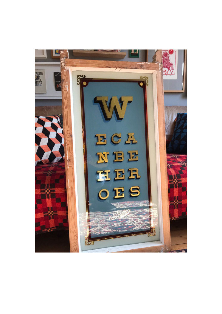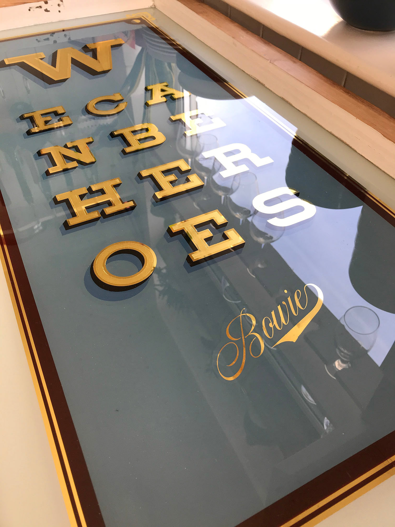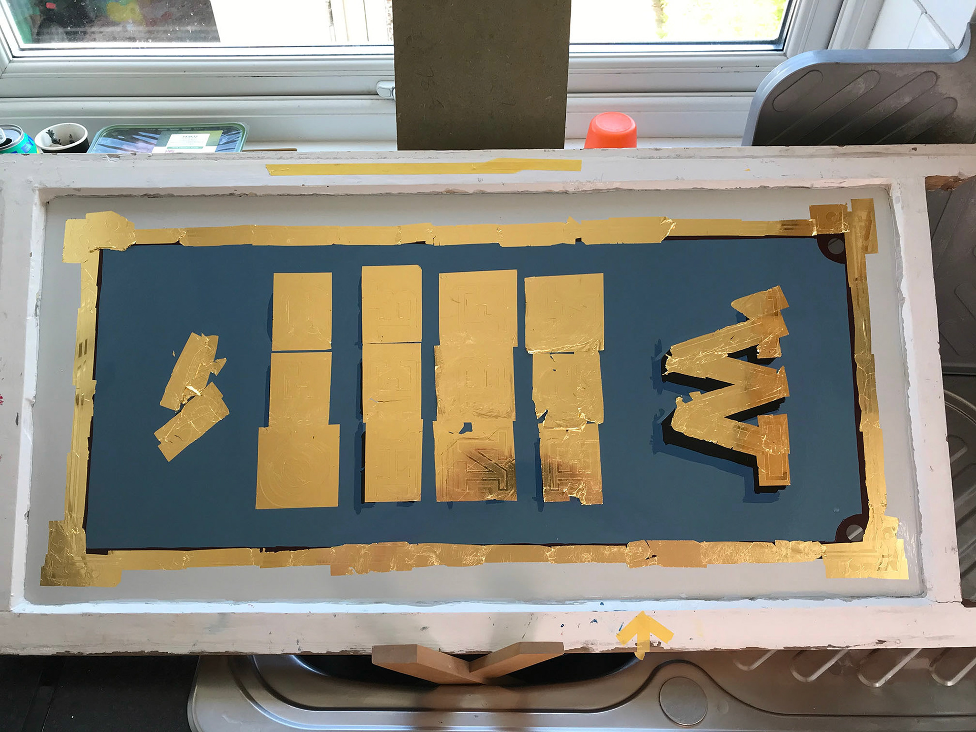 An original reverse glass gilded artwork with genuine 23ct gold leaf, set within a reused vintage sash window!