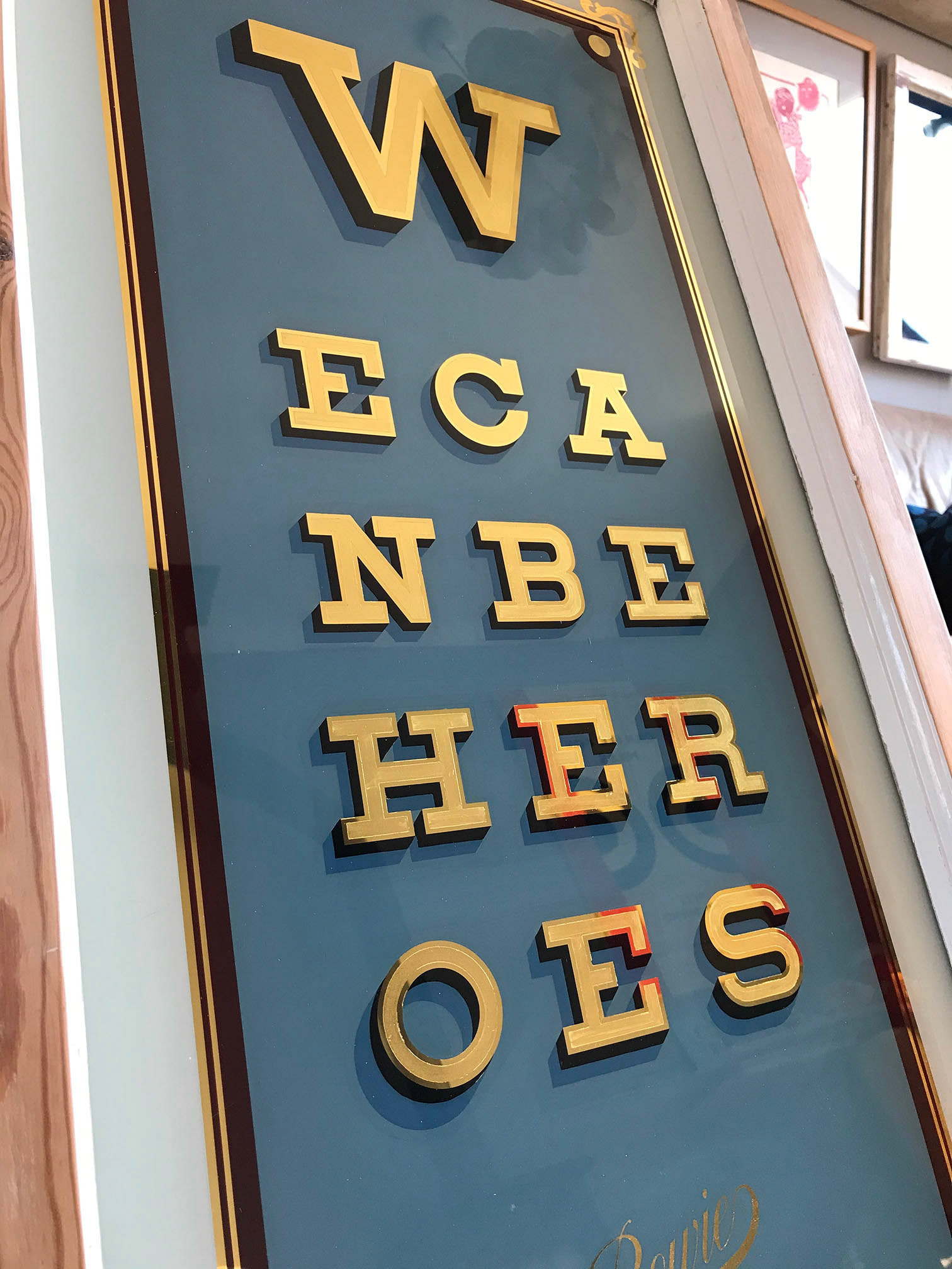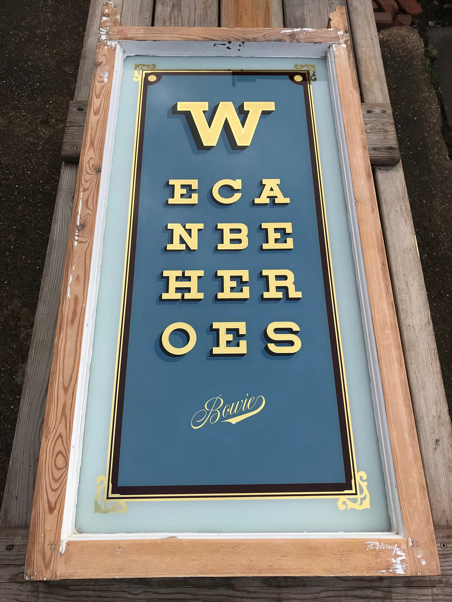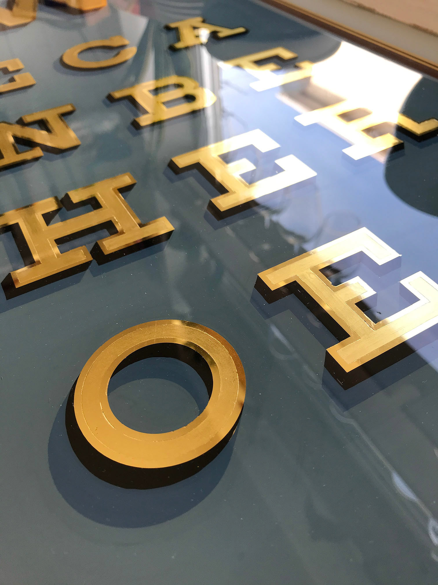 An original reverse glass gilded artwork with genuine 23ct gold leaf, set within a reused vintage sash window!